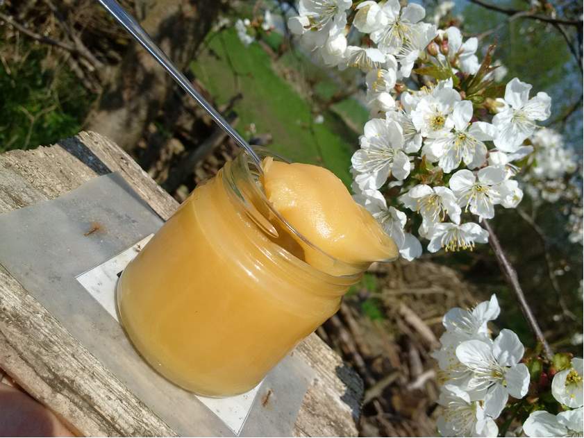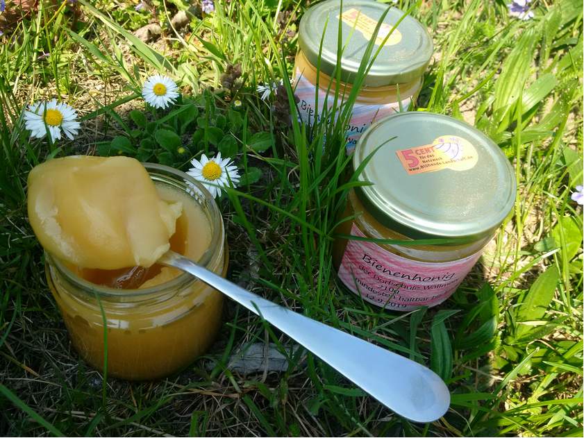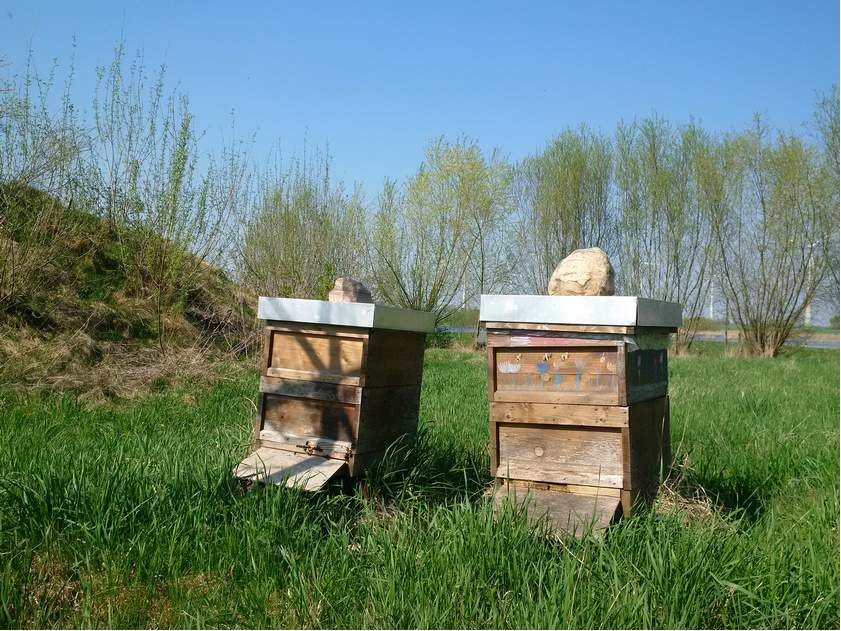 Auf unserer kleinen Streuobstwiese unter Goldparmäne, Rotem Eiserapfel, einer Conference-Birne und Quitten stehen neben vielen insektenfreundlichen Sträuchern unsere zwei Bienenvölker.